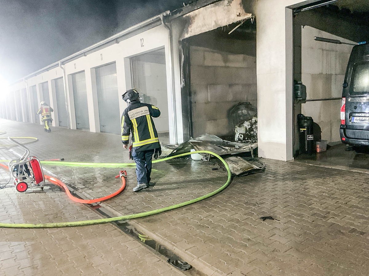 Beim Eintreffen der ersten Einsatzkräfte drang bereits dichter Rauch aus der Garage. Umgehend wurden zwei Trupps unter Atemschutz zur Brandbekämpfung eingesetzt. Durch den schnellen Löschangriff konnte eine Ausbreitung des Feuers auf angrenzende Garagen verhindert werden.