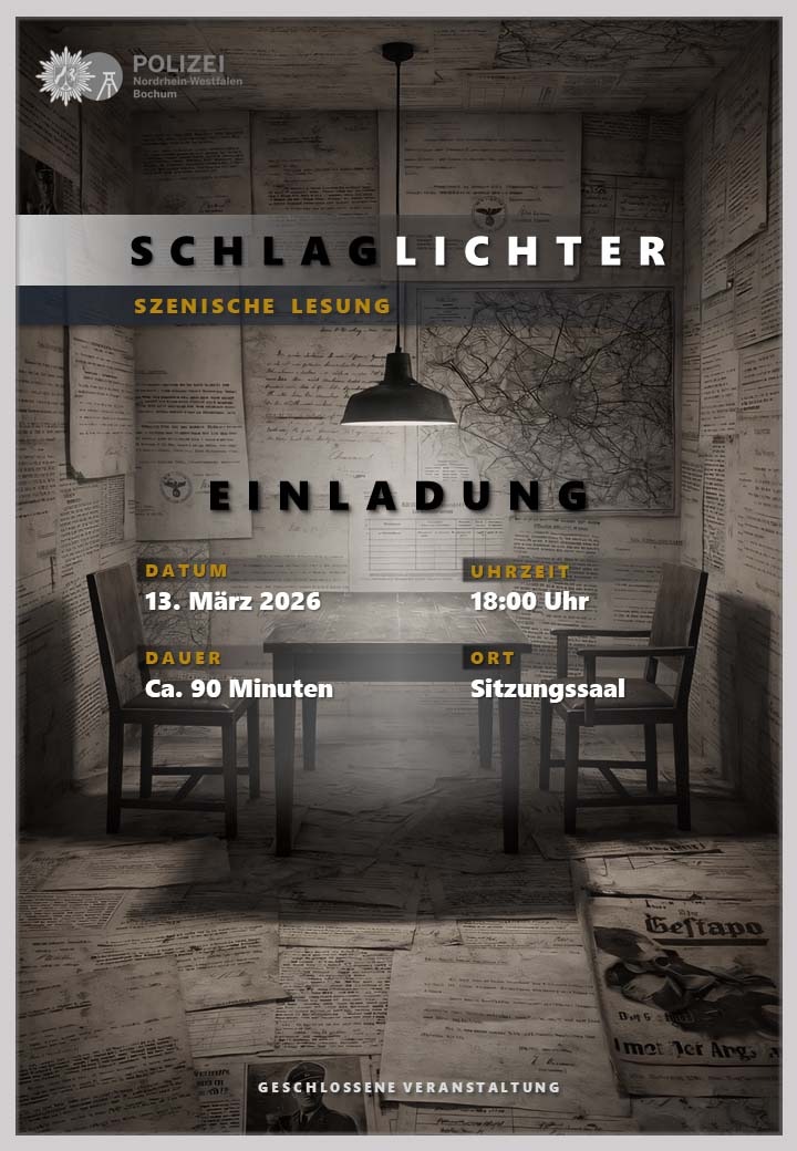 Am 13. März findet im Polizeipräsidium Bochum eine szenische Lesung statt, die von einer Projektgruppe aus Mitarbeitenden des PP Bochum konzipiert und erarbeitet wurde. Die Aufführung wird in dieser Form nur einmalig vor einem ausgewählten Personenkreis präsentiert.